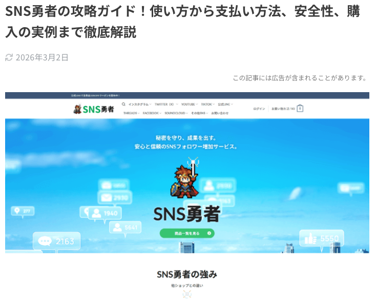 sns magazine様の「SNS勇者の攻略ガイド!使い方から支払い方法、安全性、購入の実例まで徹底解説」という記事で、「SNS勇者」をご紹介いただきました。